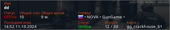 Играет на Counter Strike Source сервере. Страна: РоссияПервый раз замечен 17:04 06.06.2024