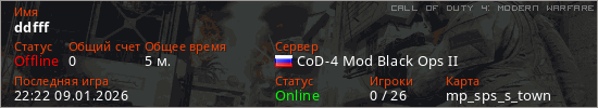 Играет на Call of Duty 4: Modern Warfare сервере. Страна: РоссияПервый раз замечен 22:11 09.01.2026