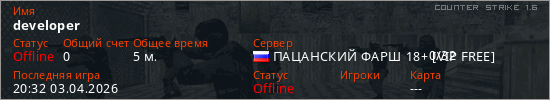 Играет на Counter Strike 1.6 сервере. Страна: РоссияПервый раз замечен 20:24 03.04.2026