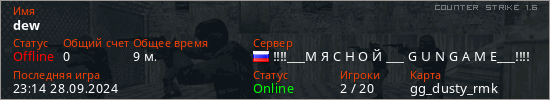 Играет на Counter Strike 1.6 сервере. Страна: РоссияПервый раз замечен 21:18 14.06.2024
