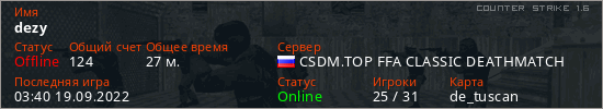 Играет на Counter Strike 1.6 сервере. Страна: РоссияПервый раз замечен 03:16 19.09.2022