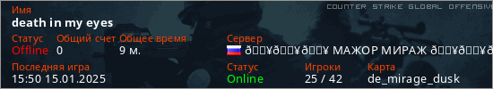 Играет на Counter Strike Global Offensive сервере. Страна: РоссияПервый раз замечен 00:00 15.01.2025