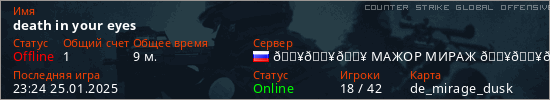 Играет на Counter Strike Global Offensive сервере. Страна: РоссияПервый раз замечен 22:32 25.01.2025