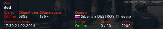 Играет на Counter Strike Source сервере. Страна: РоссияПервый раз замечен 17:18 10.02.2023