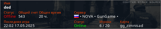 Играет на Counter Strike Source сервере. Страна: РоссияПервый раз замечен 22:00 20.12.2022