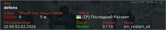 Играет на Counter Strike 1.6 сервере. Страна: УкраинаПервый раз замечен 22:49 02.02.2026