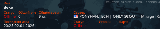 Играет на Counter Strike Global Offensive сервере. Страна: СШАПервый раз замечен 19:36 01.04.2026