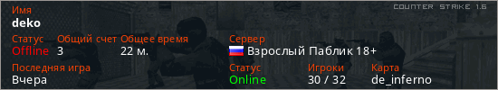 Играет на Counter Strike 1.6 сервере. Страна: РоссияПервый раз замечен 12:58 25.02.2025