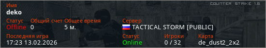 Играет на Counter Strike 1.6 сервере. Страна: РоссияПервый раз замечен 17:14 13.02.2026