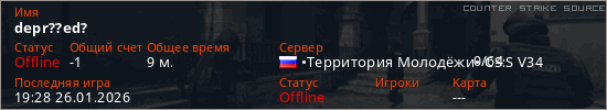 Играет на Counter Strike Source сервере. Страна: РоссияПервый раз замечен 21:18 25.01.2026