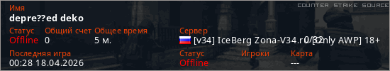 Играет на Counter Strike Source сервере. Страна: РоссияПервый раз замечен 00:17 18.04.2026
