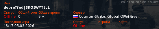 Играет на Counter Strike Source сервере. Страна: РоссияПервый раз замечен 21:24 04.03.2026