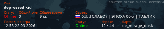 Играет на Counter Strike Global Offensive сервере. Страна: РоссияПервый раз замечен 23:28 23.05.2025