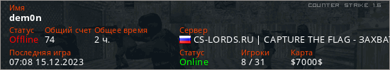 Играет на Counter Strike 1.6 сервере. Страна: РоссияПервый раз замечен 12:07 14.06.2022