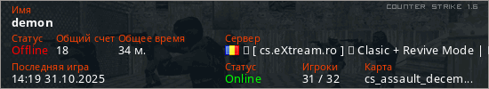 Играет на Counter Strike 1.6 сервере. Страна: РумынияПервый раз замечен 14:05 23.01.2025