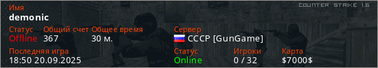 Играет на Counter Strike 1.6 сервере. Страна: РоссияПервый раз замечен 23:00 19.09.2025