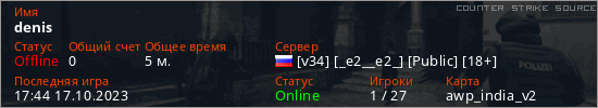 Играет на Counter Strike Source сервере. Страна: РоссияПервый раз замечен 17:27 17.10.2023