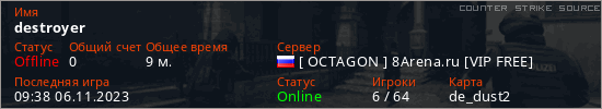 Играет на Counter Strike Source сервере. Страна: РоссияПервый раз замечен 23:00 04.04.2023