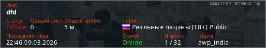 Играет на Counter Strike 1.6 сервере. Страна: РоссияПервый раз замечен 22:10 09.03.2026