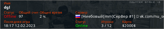 Последний раз был в сети 18:17 12.02.2023 Игрок с таким ником замечен на 24 серверах