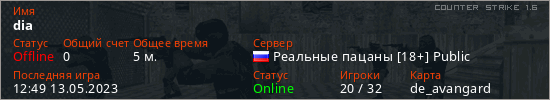 Играет на Counter Strike 1.6 сервере. Страна: РоссияПервый раз замечен 12:47 13.05.2023