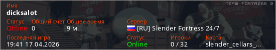 Играет на Team Fortress 2 сервере. Страна: РоссияПервый раз замечен 20:52 01.04.2026