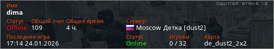 Играет на Counter Strike 1.6 сервере. Страна: РоссияПервый раз замечен 12:52 20.09.2021