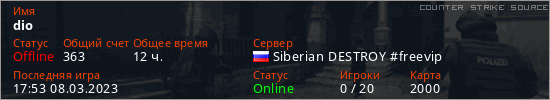 Играет на Counter Strike Source сервере. Страна: РоссияПервый раз замечен 17:18 23.02.2023