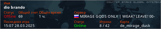 Играет на Counter Strike Global Offensive сервере. Страна: РоссияПервый раз замечен 12:12 08.03.2025