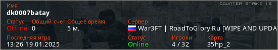 Играет на Counter Strike 1.6 сервере. Страна: РоссияПервый раз замечен 13:24 19.01.2025