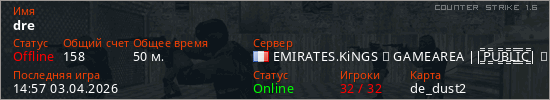 Играет на Counter Strike 1.6 сервере. Страна: ФранцияПервый раз замечен 15:00 29.03.2026