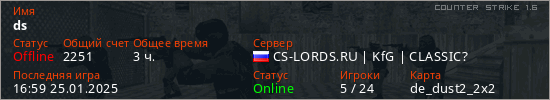 Играет на Counter Strike 1.6 сервере. Страна: РоссияПервый раз замечен 12:59 25.01.2025