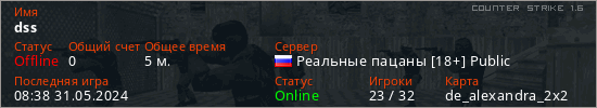 Играет на Counter Strike 1.6 сервере. Страна: РоссияПервый раз замечен 08:36 31.05.2024