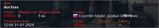 Играет на Counter Strike Source сервере. Страна: РоссияПервый раз замечен 11:33 31.01.2026