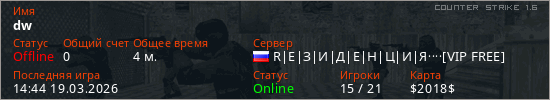 Играет на Counter Strike 1.6 сервере. Страна: РоссияПервый раз замечен 14:42 19.03.2026