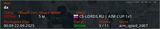 Играет на Counter Strike 1.6 сервере. Страна: РоссияПервый раз замечен 00:07 22.06.2025