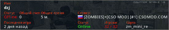 Играет на Counter Strike 1.6 сервере. Страна: РоссияПервый раз замечен 02:17 28.03.2026