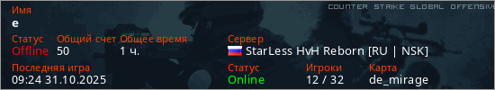 Играет на Counter Strike Global Offensive сервере. Страна: РоссияПервый раз замечен 08:13 26.09.2025