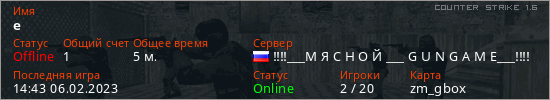 Играет на Counter Strike 1.6 сервере. Страна: РоссияПервый раз замечен 14:41 06.02.2023
