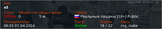 Играет на Counter Strike 1.6 сервере. Страна: РоссияПервый раз замечен 09:33 01.04.2024