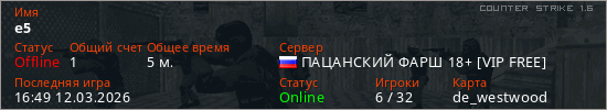 Играет на Counter Strike 1.6 сервере. Страна: РоссияПервый раз замечен 16:47 12.03.2026