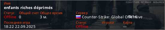Играет на Counter Strike Source сервере. Страна: РоссияПервый раз замечен 18:22 22.09.2025