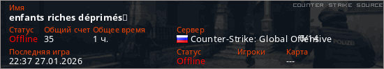 Играет на Counter Strike Source сервере. Страна: РоссияПервый раз замечен 20:38 01.12.2025