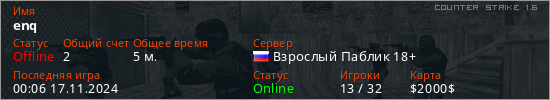 Играет на Counter Strike 1.6 сервере. Страна: РоссияПервый раз замечен 22:48 16.11.2024