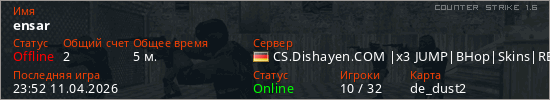 Играет на Counter Strike 1.6 сервере. Страна: ГерманияПервый раз замечен 23:35 11.04.2026