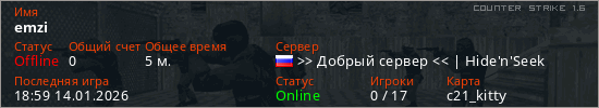 Играет на Counter Strike 1.6 сервере. Страна: РоссияПервый раз замечен 18:51 14.01.2026