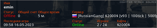 Играет на Counter Strike Source сервере. Страна: РоссияПервый раз замечен 09:49 16.05.2023