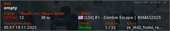 Играет на Counter Strike 1.6 сервере. Страна: СШАПервый раз замечен 08:17 10.10.2025