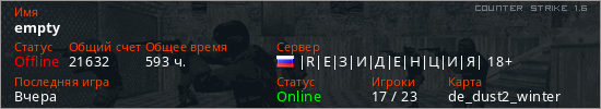 Играет на Counter Strike 1.6 сервере. Страна: РоссияПервый раз замечен 20:46 25.01.2019