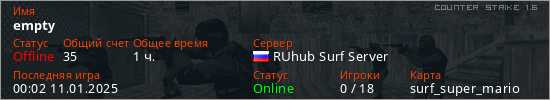 Играет на Counter Strike 1.6 сервере. Страна: РоссияПервый раз замечен 21:37 30.03.2022